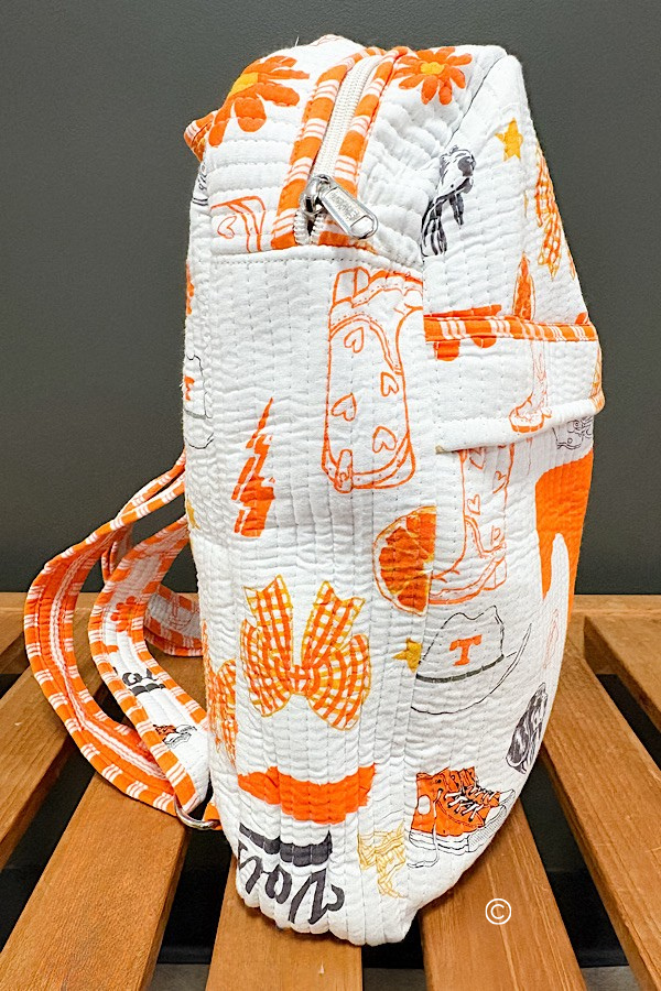 Game day just got a whole lot cuter! This University of Tennessee backpack brings the perfect blend of team spirit and everyday style. Featuring a bold Power T front and an allover print of bows, stars, Smokey the dog, and other Vol-themed icons in bright orange and white, it’s the ultimate accessory for proud Tennessee fans. The roomy main compartment and front zipper pocket keep your essentials organized, while the comfortable straps make it easy to carry from class to tailgate. Whether you’re headed to Neyland Stadium or just repping your team around town, this backpack is your new go-to for Vols pride on the move.