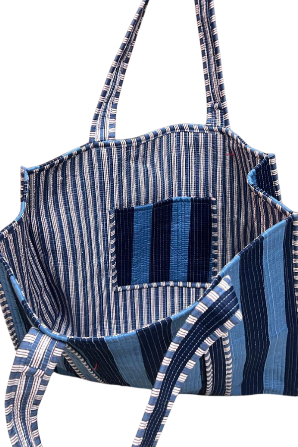 Classic stripes meet everyday function. This blue striped tote features a beautifully textured fabric with layered shades of navy and sky blue for a timeless, coastal-inspired look. Spacious and sturdy with comfortable shoulder straps, it’s perfect for errands, workdays, market runs, or weekends away. An effortless grab-and-go bag you’ll reach for again and again.