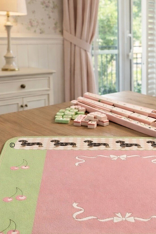 Add a little personality to every play with this custom copyrighted mahjong mat, designed to be as practical as it is charming. Featuring our exclusive dachshund-and-cherry design, this mat brings playful style to game night while protecting your table.