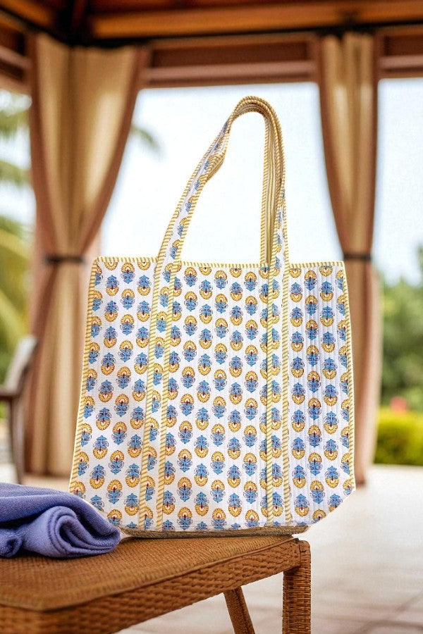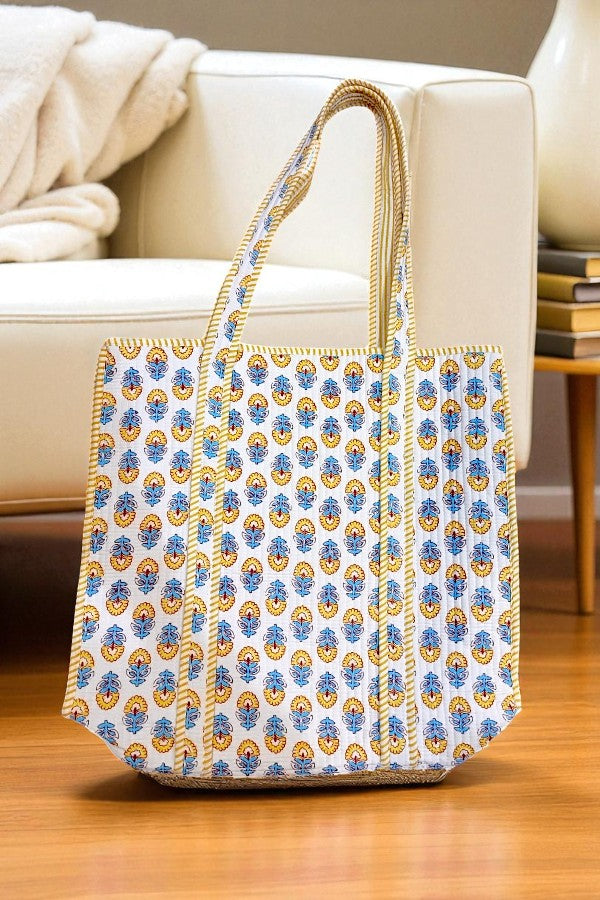 Bring a little sunshine into crisp autumn days with this cheerful floral tote bag! 🍂✨ Featuring a charming block-print inspired pattern in golden yellow and soft blue, this bag feels both timeless and seasonal. The striped trim and handles add a playful detail, making it a standout piece you’ll reach for again and again.