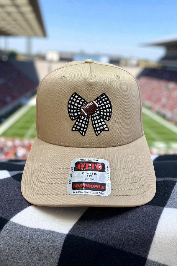 This beige cap is the perfect blend of sporty and stylish with its bold black-and-white gingham bow topped with a classic football detail. Whether youโre cheering from the stands or tailgating with friends, this hat is made to show off your team spirit with a touch of charm. Designed with a comfortable mid-profile fit, itโs an easy go-to accessory youโll reach for all season long.